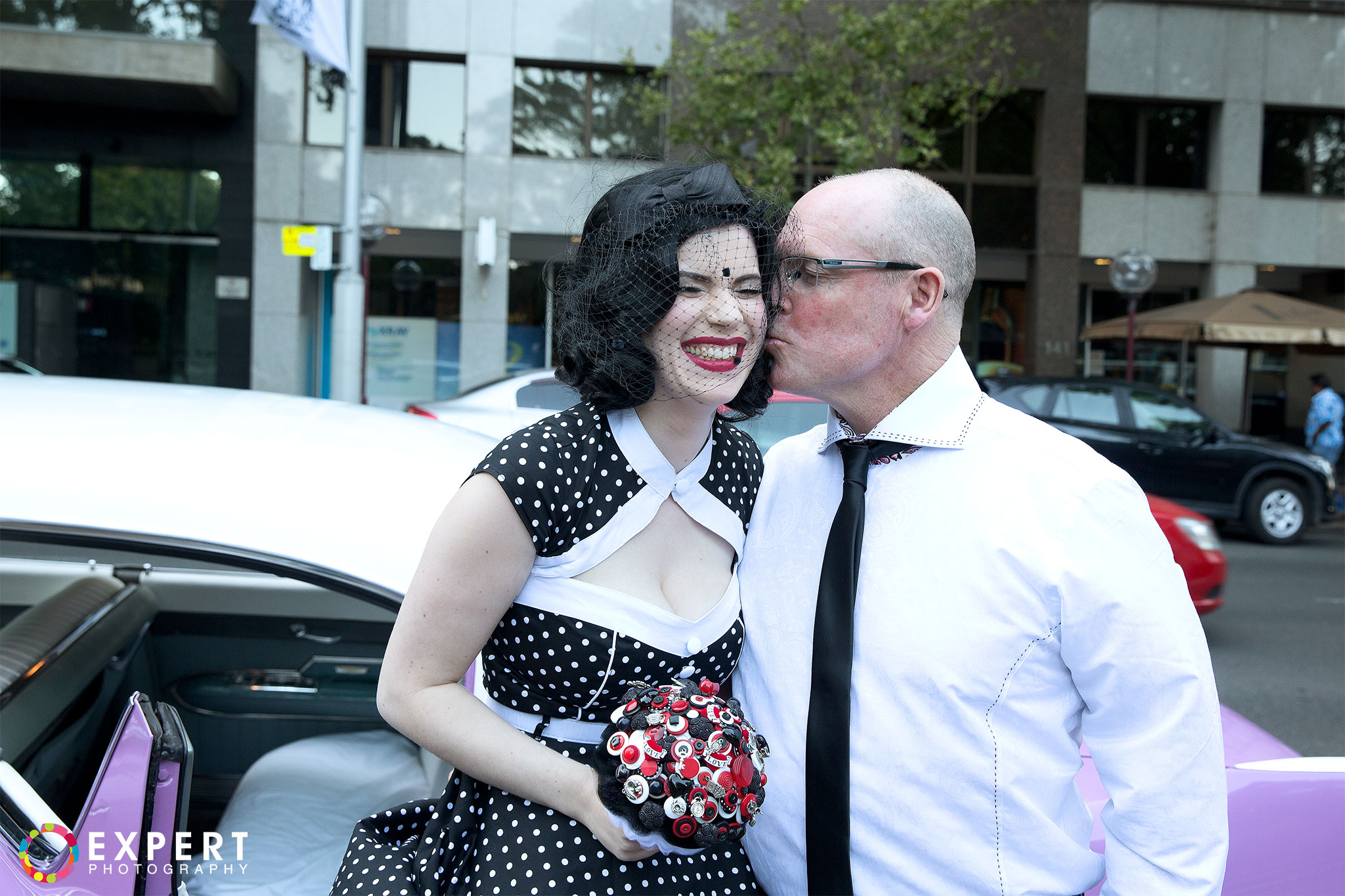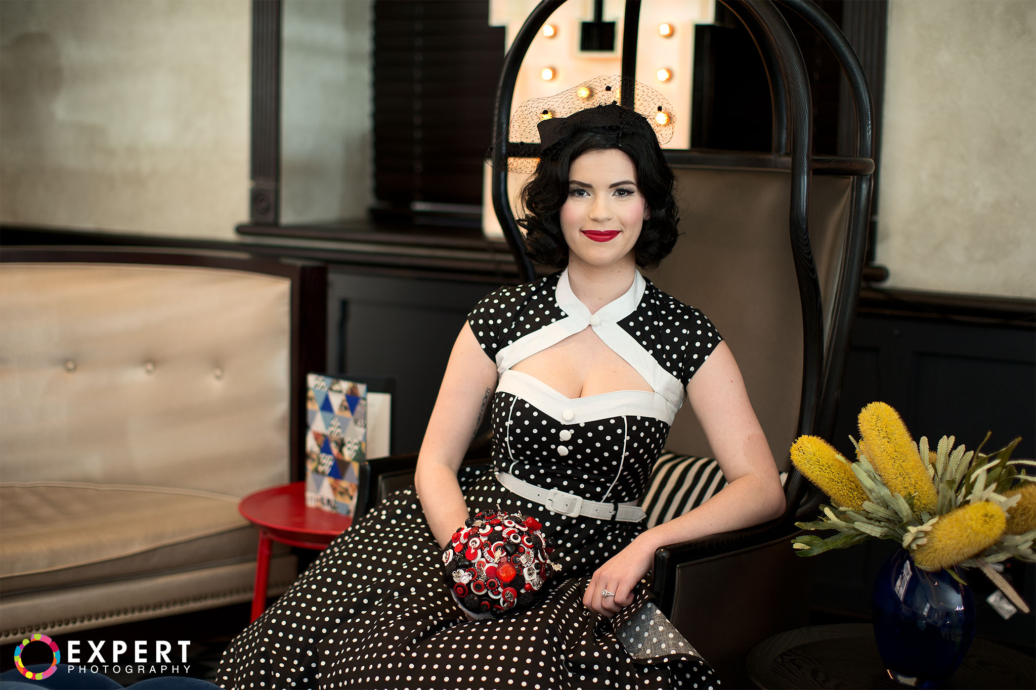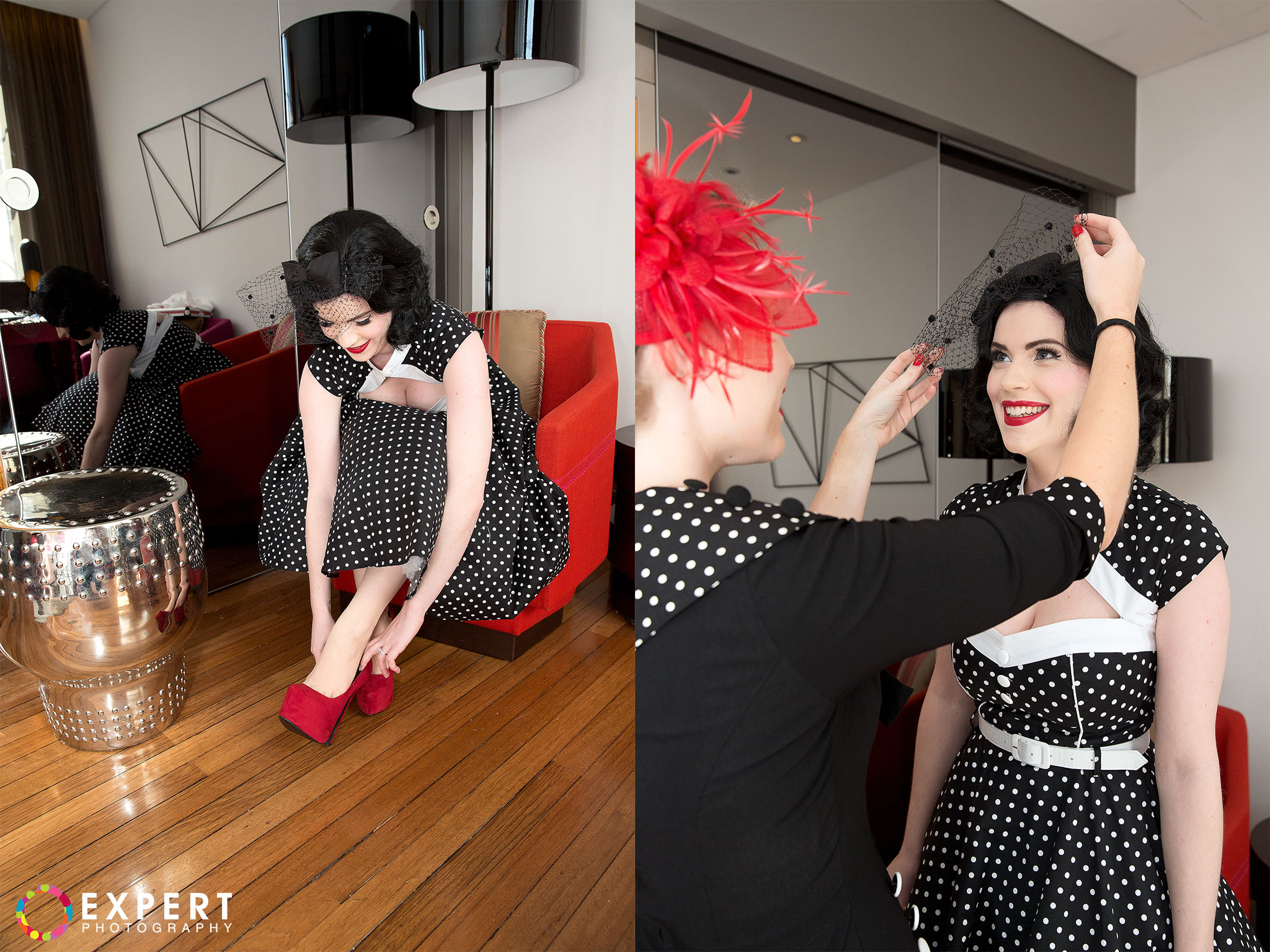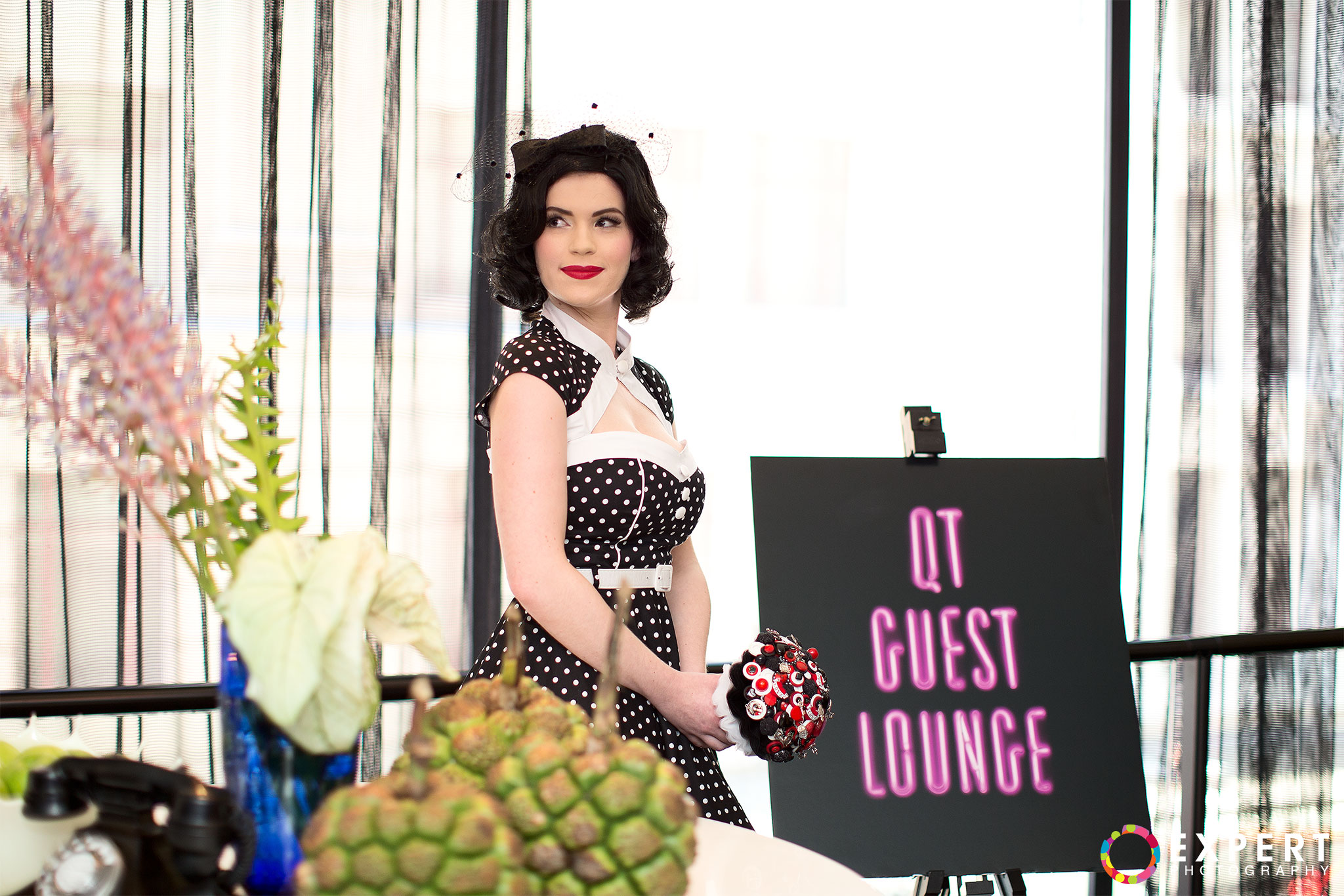 Lauren and Thorne had decided that their wedding would be something unique. The bride’s (and bridesmaids) dress has a 50’s (or 60’s?) theme to it. From the bouquet to the reception decor, everything is uniquely different. Not that I’m complaining though as it is both non-traditional but so beautiful. Even the QT Hotel were Lauren was preparing is themed like a classic movie/theatre which just blends well with her look.