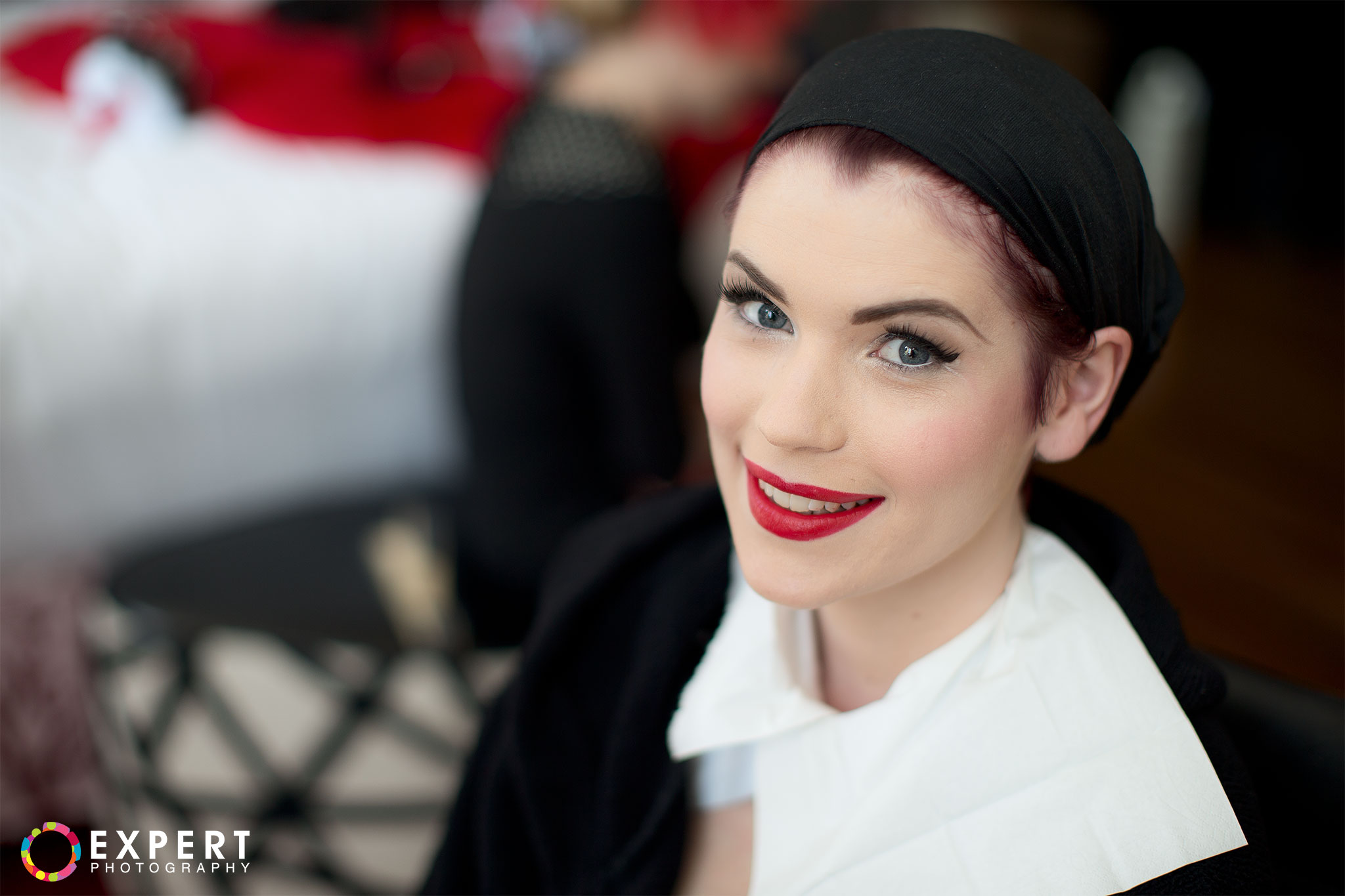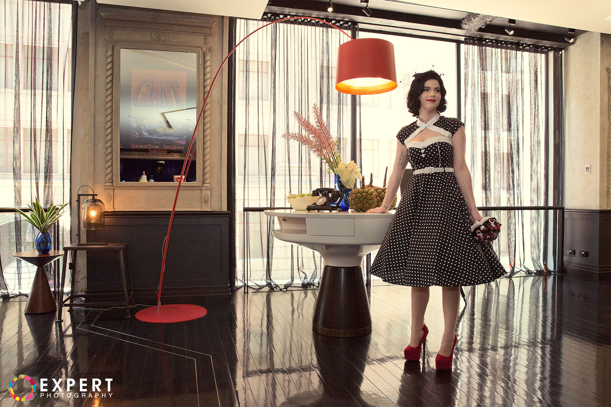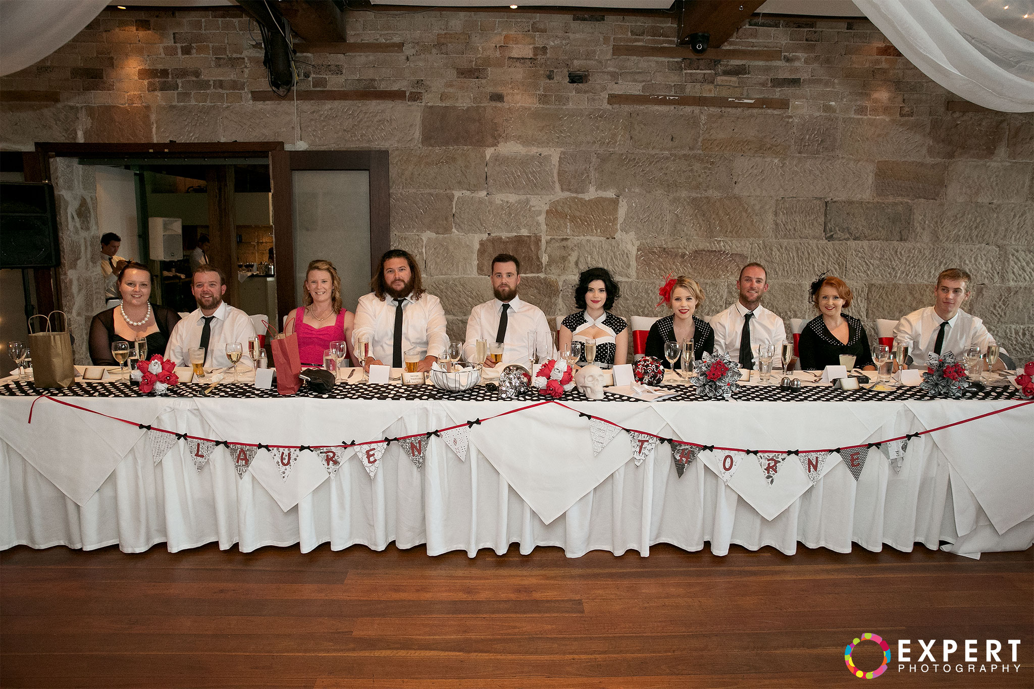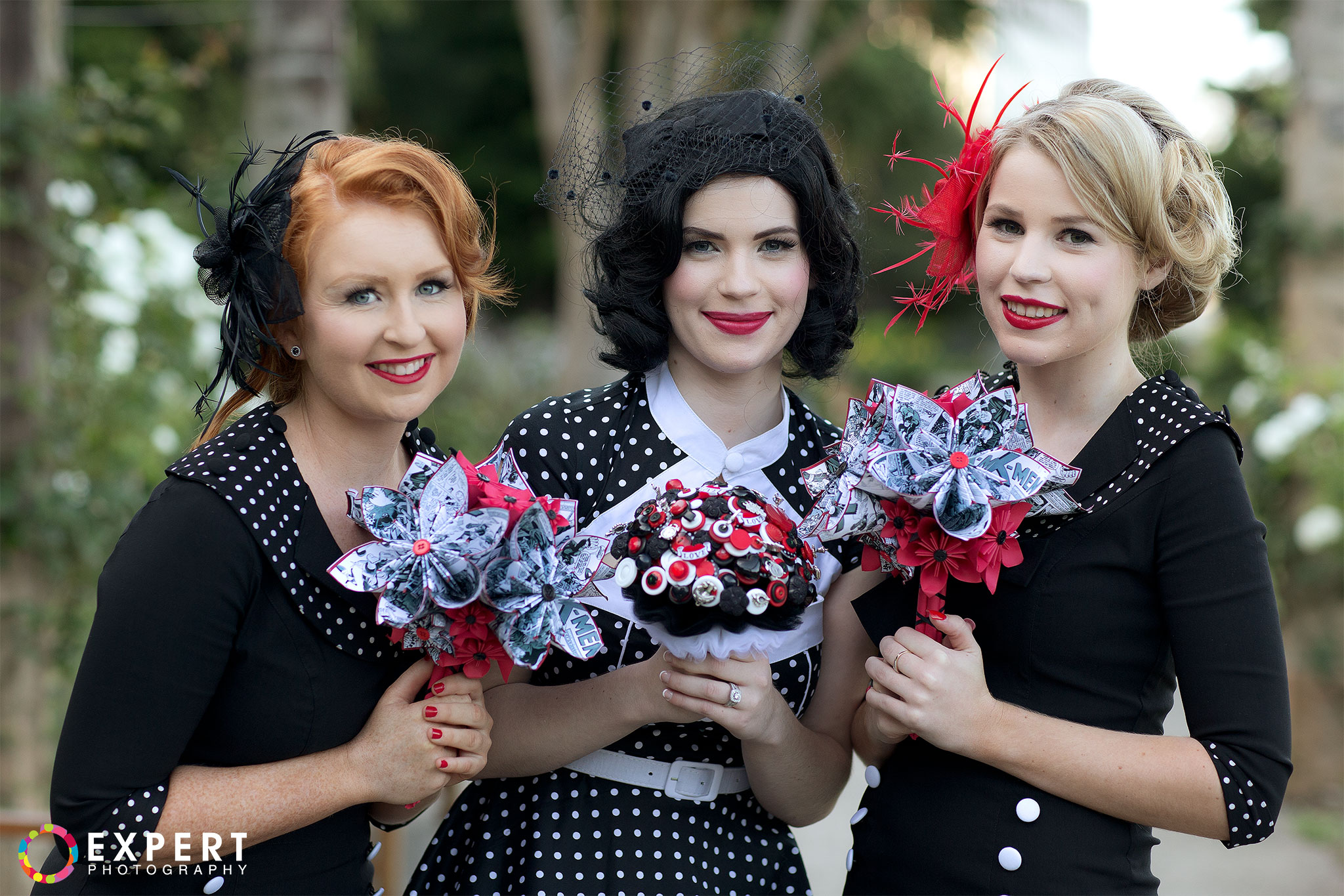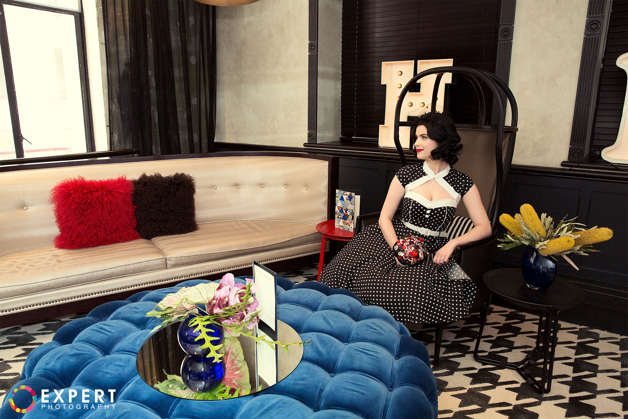Lauren and Thorne had decided that their wedding would be something unique. The bride’s (and bridesmaids) dress has a 50’s (or 60’s?) theme to it. From the bouquet to the reception decor, everything is uniquely different. Not that I’m complaining though as it is both non-traditional but so beautiful. Even the QT Hotel were Lauren was preparing is themed like a classic movie/theatre which just blends well with her look.
