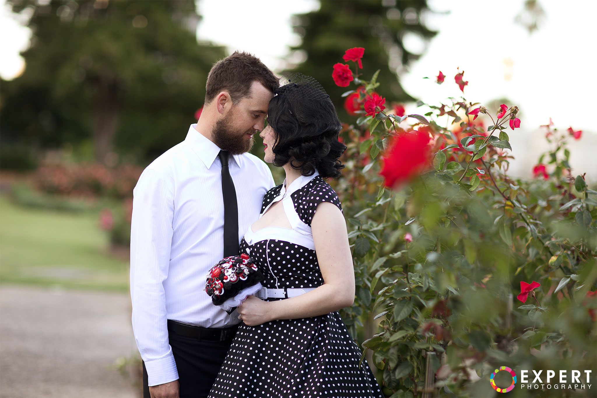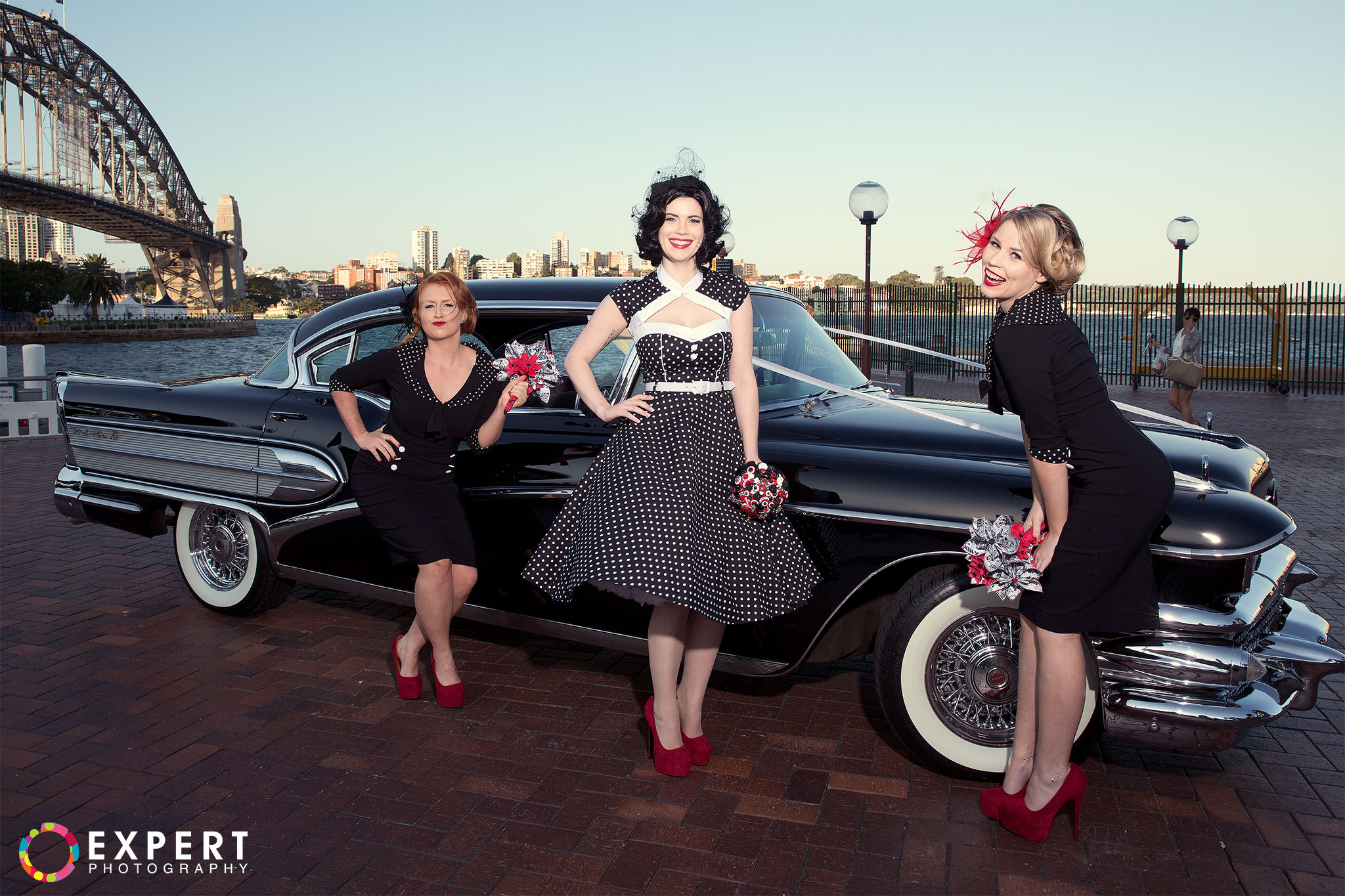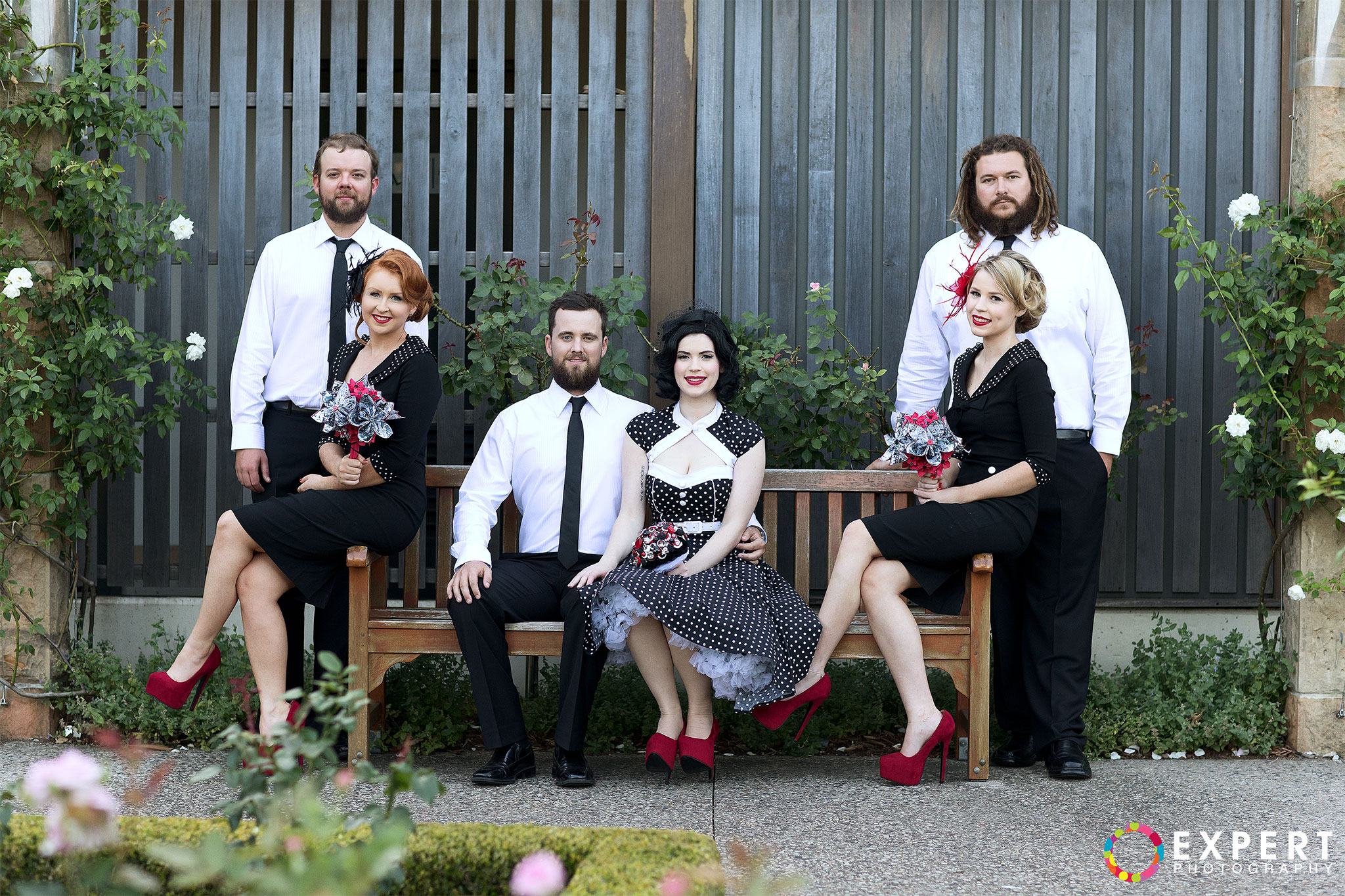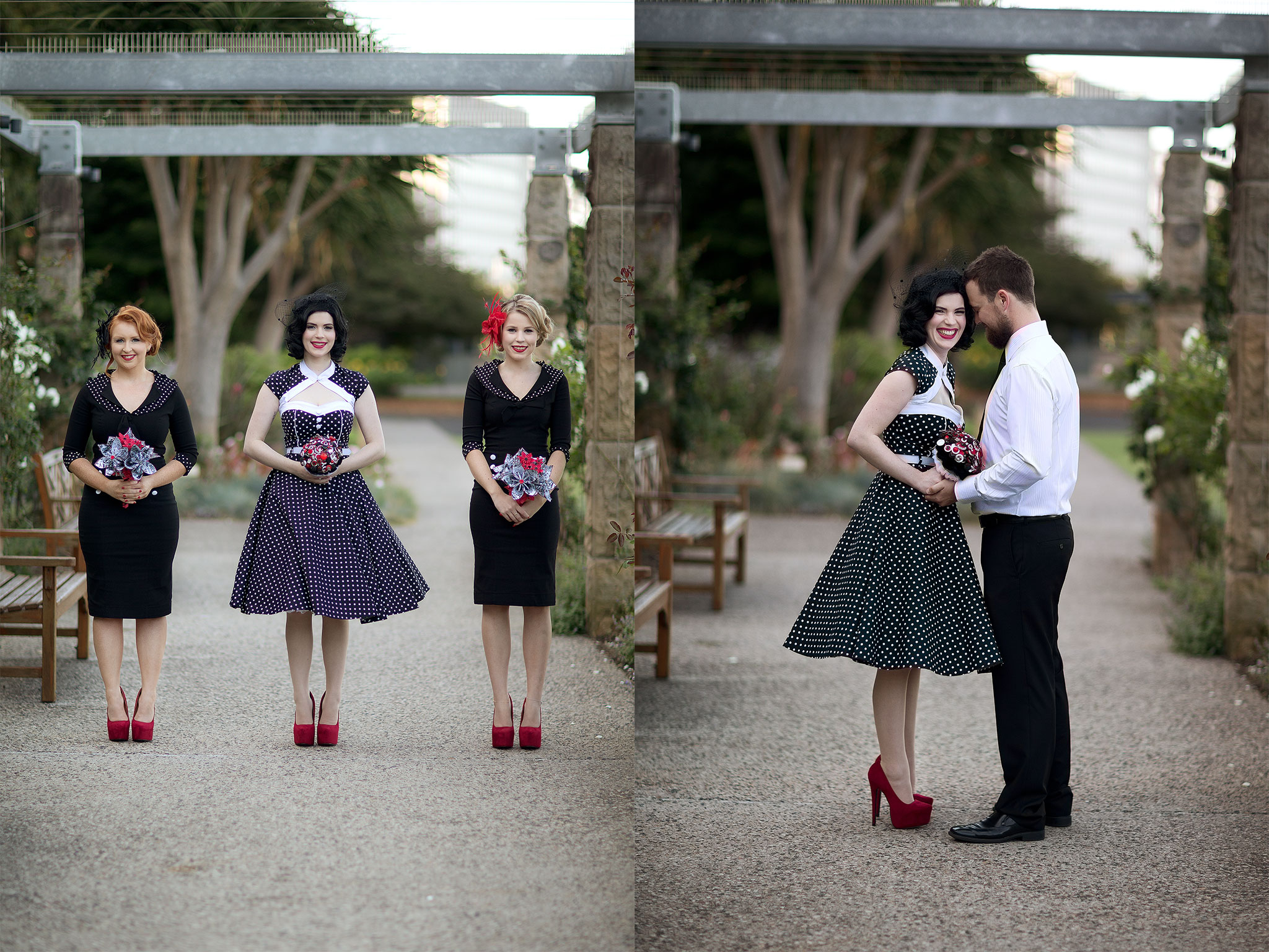 Lauren and Thorne had decided that their wedding would be something unique. The bride’s (and bridesmaids) dress has a 50’s (or 60’s?) theme to it. From the bouquet to the reception decor, everything is uniquely different. Not that I’m complaining though as it is both non-traditional but so beautiful. Even the QT Hotel were Lauren was preparing is themed like a classic movie/theatre which just blends well with her look.