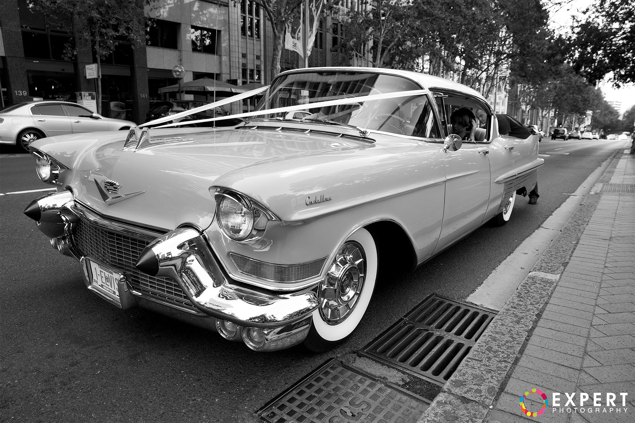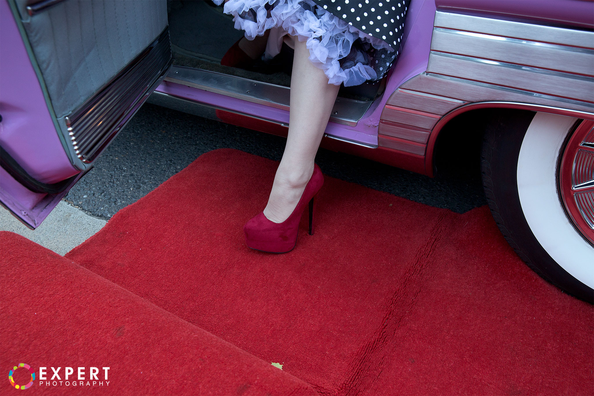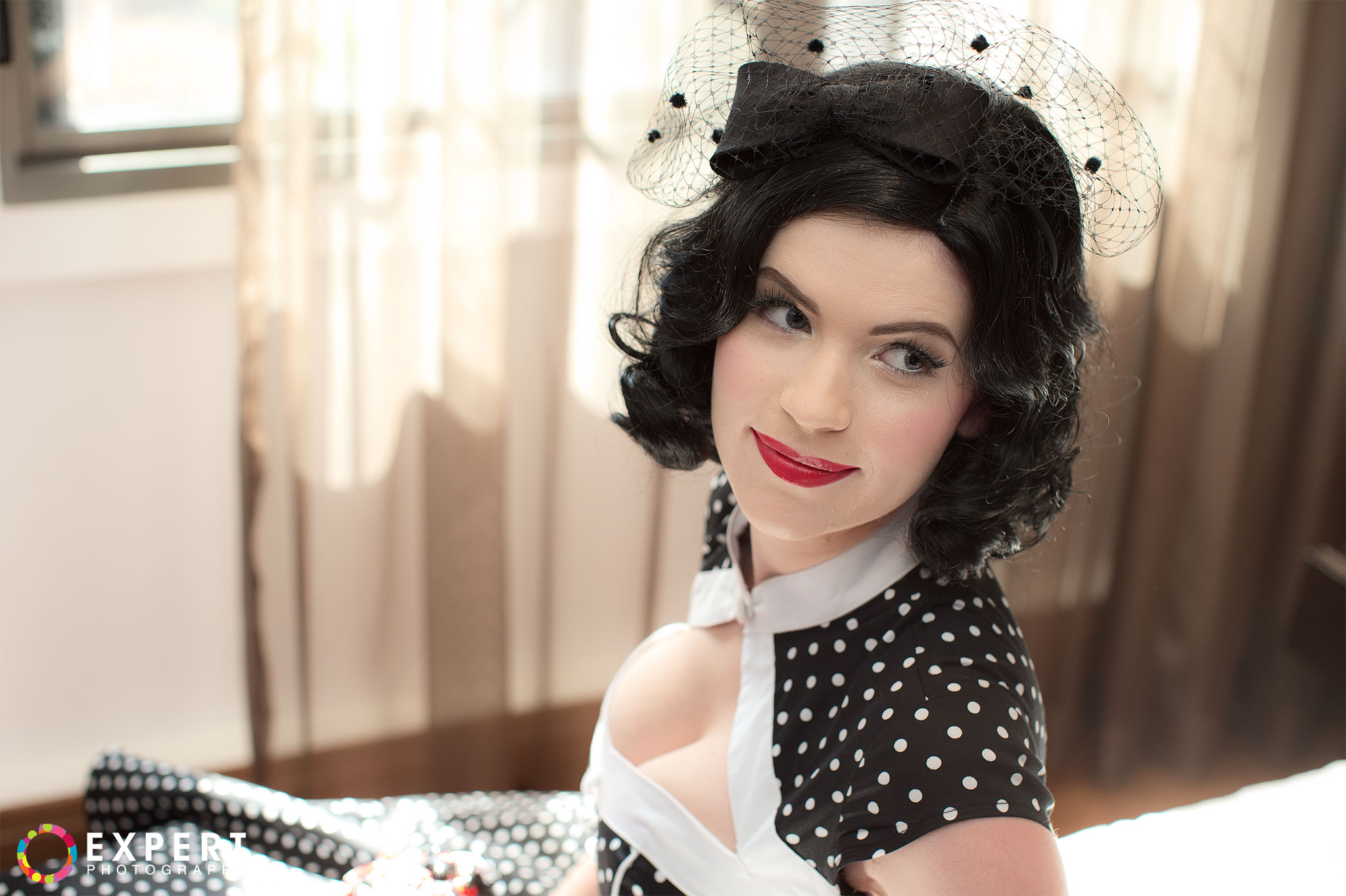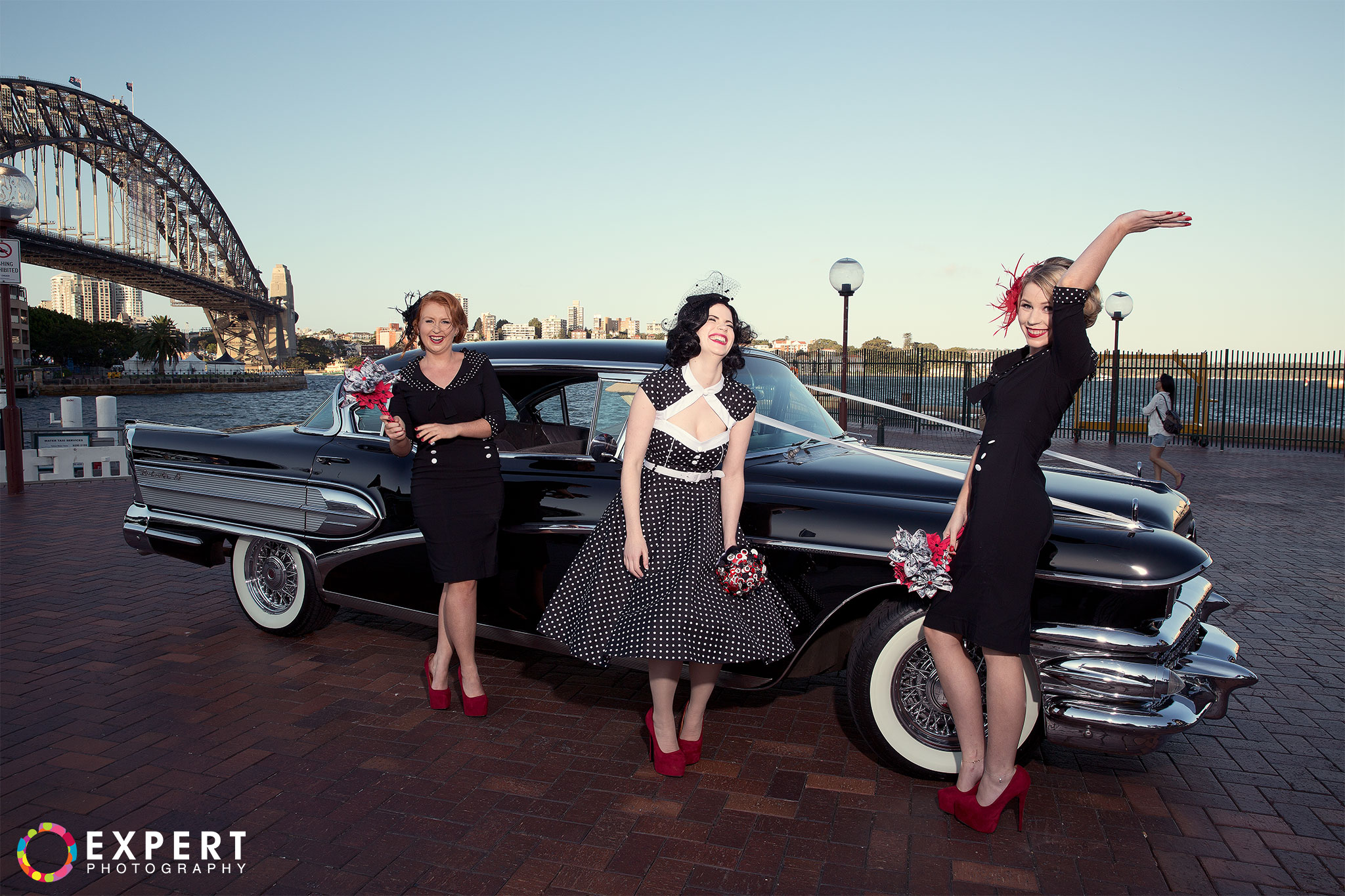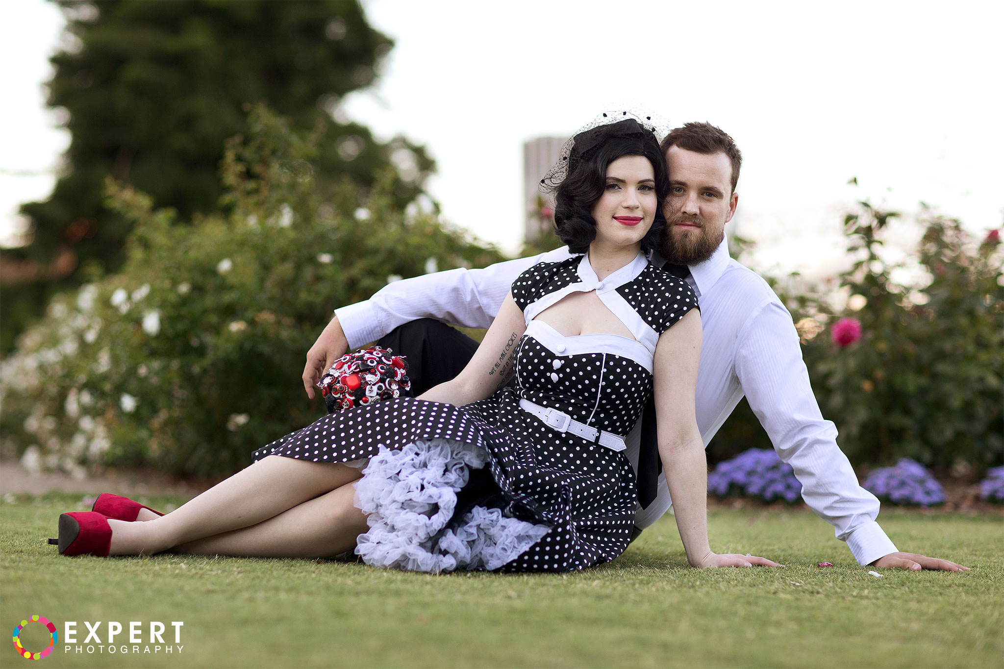 Lauren and Thorne had decided that their wedding would be something unique. The bride’s (and bridesmaids) dress has a 50’s (or 60’s?) theme to it. From the bouquet to the reception decor, everything is uniquely different. Not that I’m complaining though as it is both non-traditional but so beautiful. Even the QT Hotel were Lauren was preparing is themed like a classic movie/theatre which just blends well with her look.