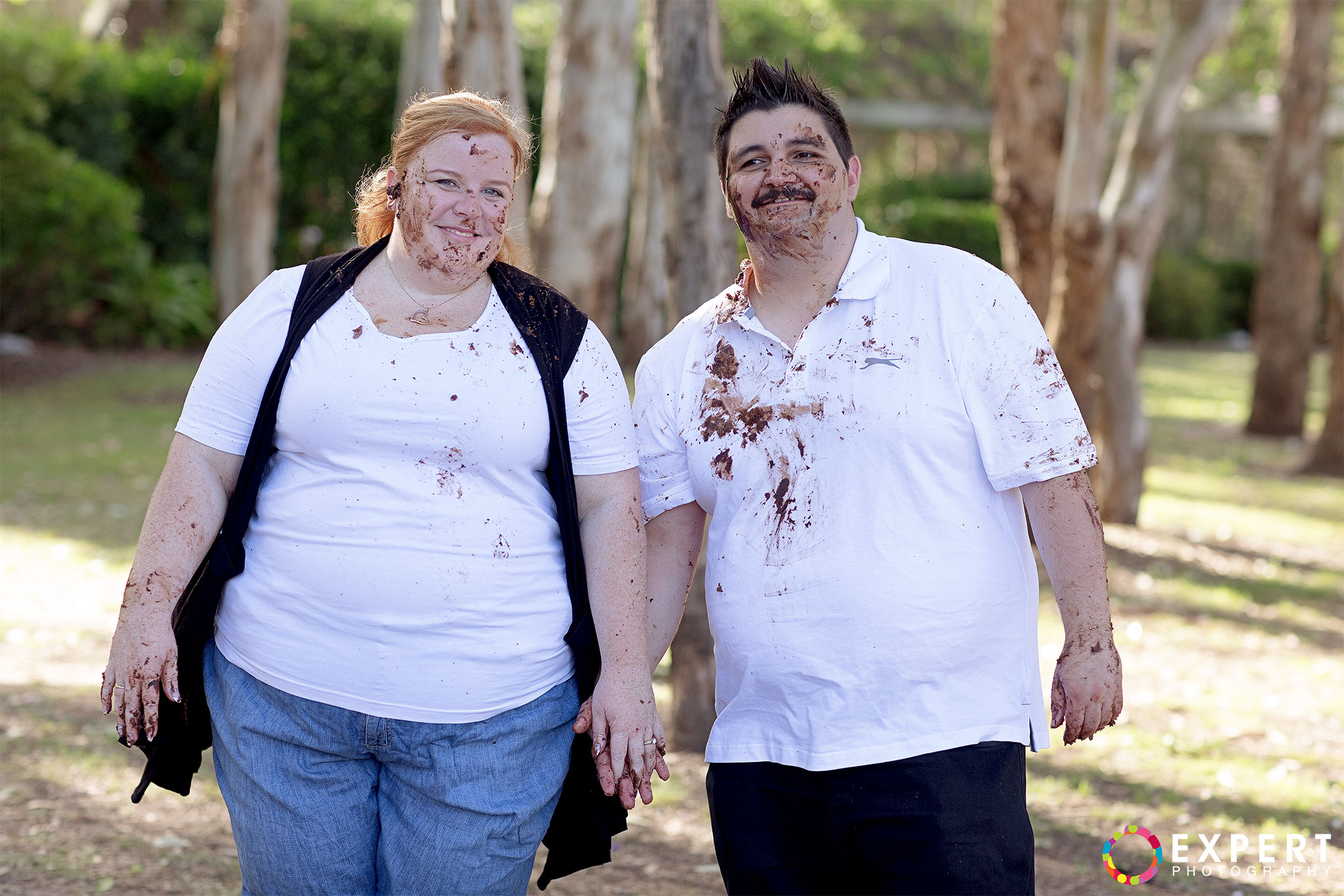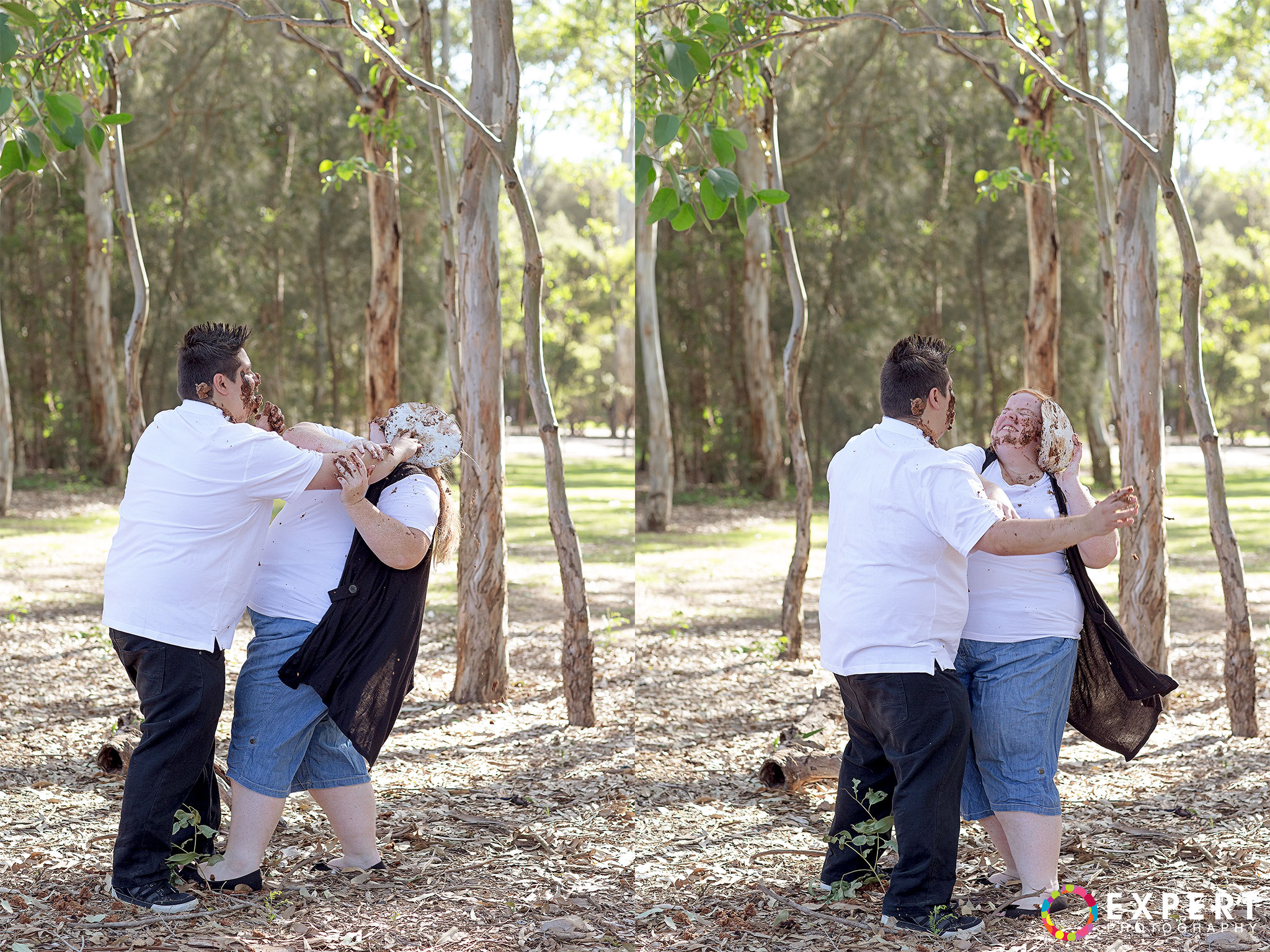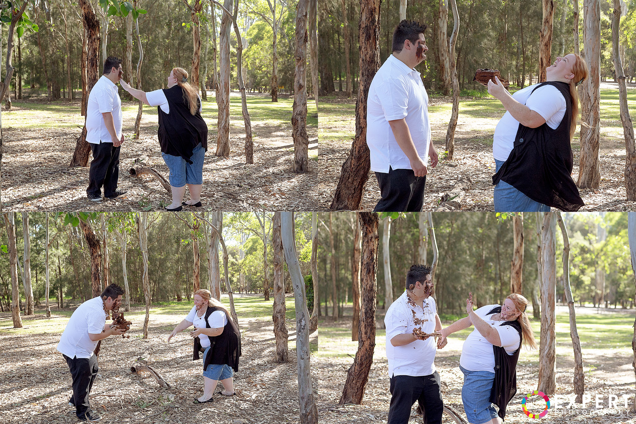 Now back to the cake at our pre-wedding shoot. They actually have this idea that they will do a cake fight at the end of the photo shoot. I thought to myself…hmmm this could be interesting. So we did our shoot and then they changed to another outfit. They first started slow like a boxer probing each others style. Kylie first wiped a piece of icing on Robbie’s face. Then he hit back gently, and then suddenly it turned into an all out mayhem! It was so funny to watch and my only regret is I should have had a videoman filming the event. Another funny thing is before the “fight” one parent called (can’t remember who) asking where was the cake that they had on the fridge. Little did she know what happened to it! It was a great end (although very unusual) to a pre-wedding shoot.