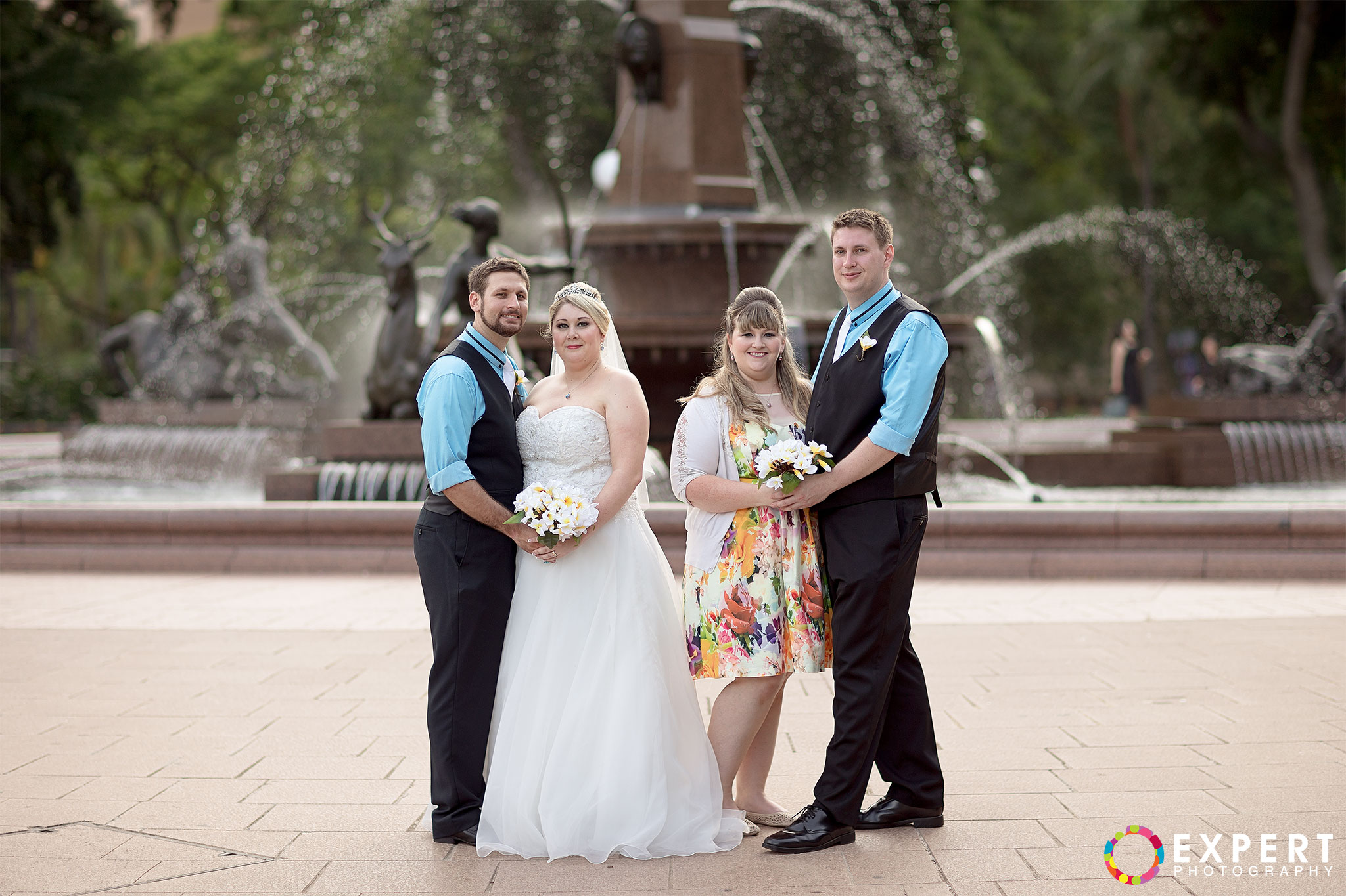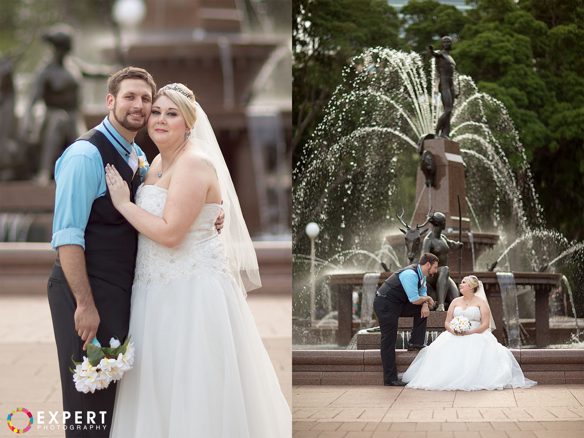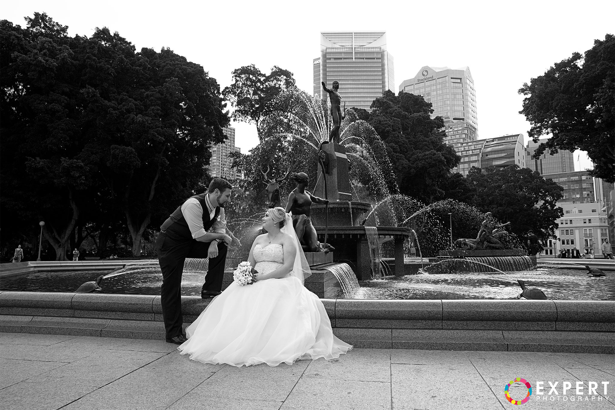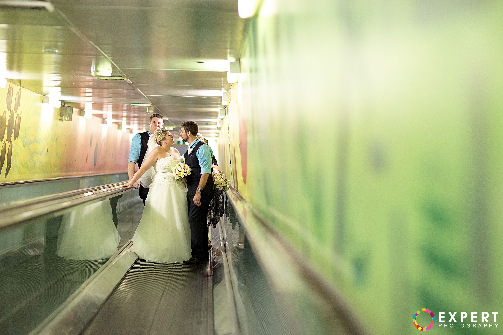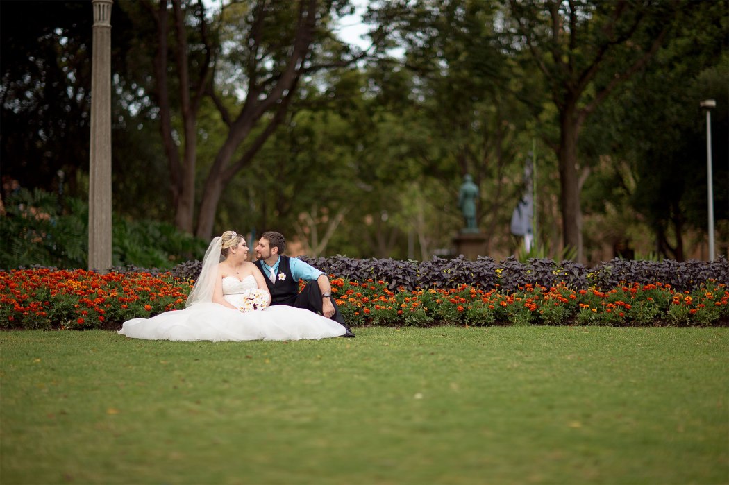 The ceremony was a nice and simple affair attended only by their immediate family and friends. The rooftop of the building where the wedding took place had a very nice view of Sydney Harbour and the CBD. After the ceremony, we trekked to Hyde Park via the Domain Express Moving Walkway for our location shoot. The original plan was to walk to Darling harbour for the reception at The Meat Wine and Co. But with Tara on a wedding dress wearing heels, it’s kinda difficult. So it was decided that Tara, her bridesmaid, and me will just take a cab. Barry and his best man will return to their apartment to get their car and other items for the reception. It’s really funny seeing a bride on the street hailing a taxi. You can see that the taxi driver was amused as how often do you get an actual bride as a passenger!